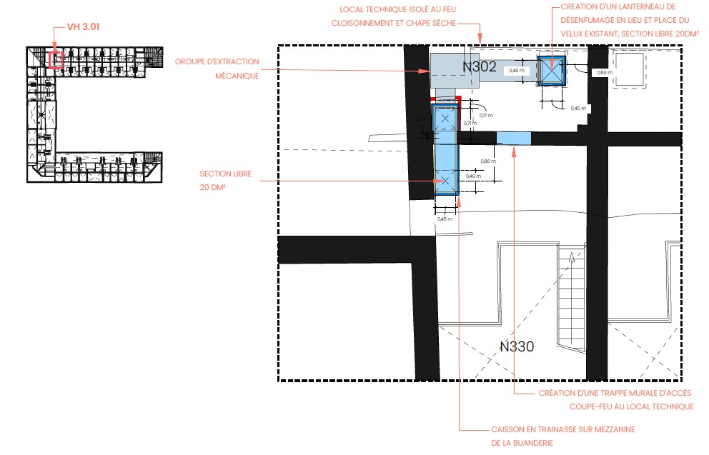 Locaux techniques dédiés : Création de locaux techniques spécifiques pour le désenfumage, traités coupe-feu 1H.